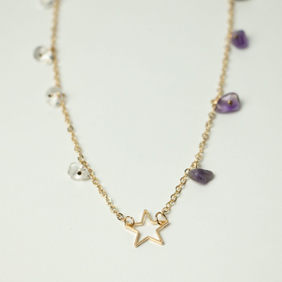 COLAR SEMENTE ESTRELAR CASCALHO AMETISTA+ CRISTAL BANHO OURO
